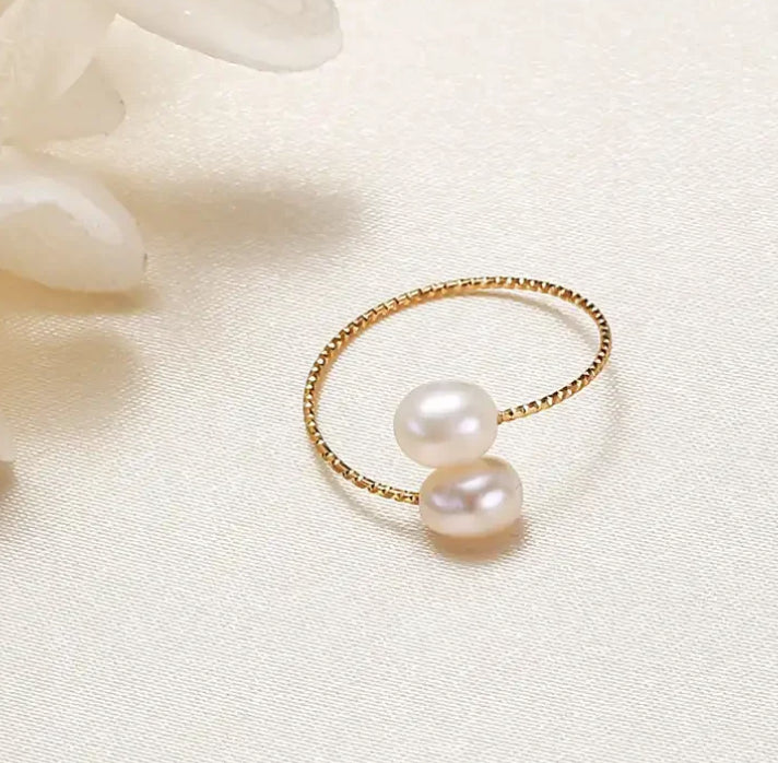 Our Fern Freshwater Pearl Ring, a sparkling sensation coated in 14K gold plating that boasts two unique freshwater rice pearls.