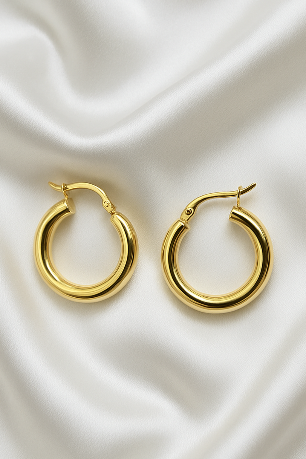 Timeless and effortlessly chic, these classic round hoops are the perfect everyday accessory. Crafted with a smooth, polished finish and plated in luxurious 18k gold, they bring a touch of elegance to any look.