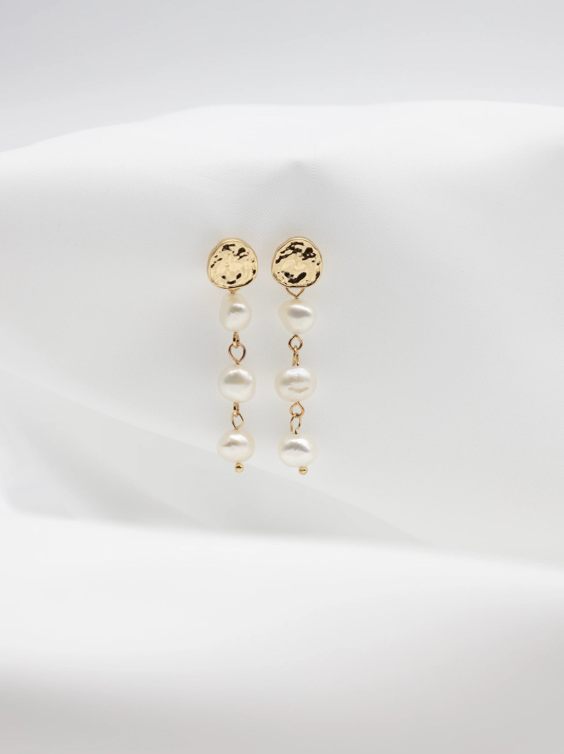 Introducing our Kristie Earrings, featuring triple baroque freshwater pearls, gracefully suspended and adorned with the timeless radiance of 18K Gold Plating, these earrings are a testament to opulence and sophistication!